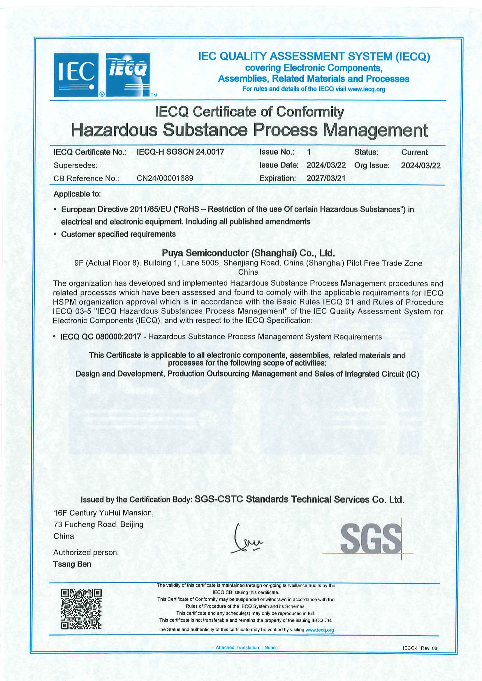 The design and sales services of PUYA's non-volatile, highly reliable memory and high-performance magnetic sensing chips have passed the ISO9001 quality management system certification.