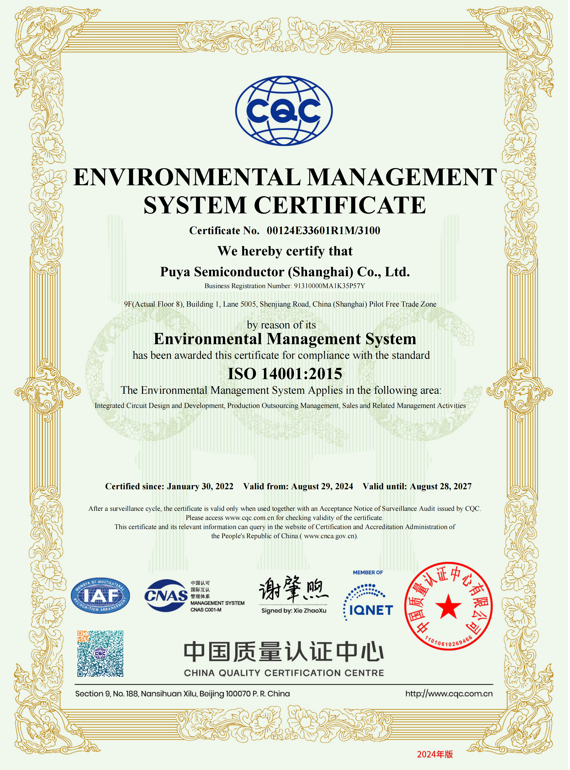 Quality prioritizes fully meeting customer needs, designing high-quality and high-performance products to lead the innovative and rapid development of non-volatile memory chips. Identify customer requirements, focus on customers, and actively engage all staff. Since 2016, Puran Group has been certified by the China Quality Center and has obtained the International Organization for Standardization (ISO) Quality Management System (ISO 9001) and Environmental Management System (ISO 14001) certificates. In the field of automotive quality management system, we adhere to the ISO 26262 standard for automotive functional safety, meeting the stringent requirements of the automotive application field.